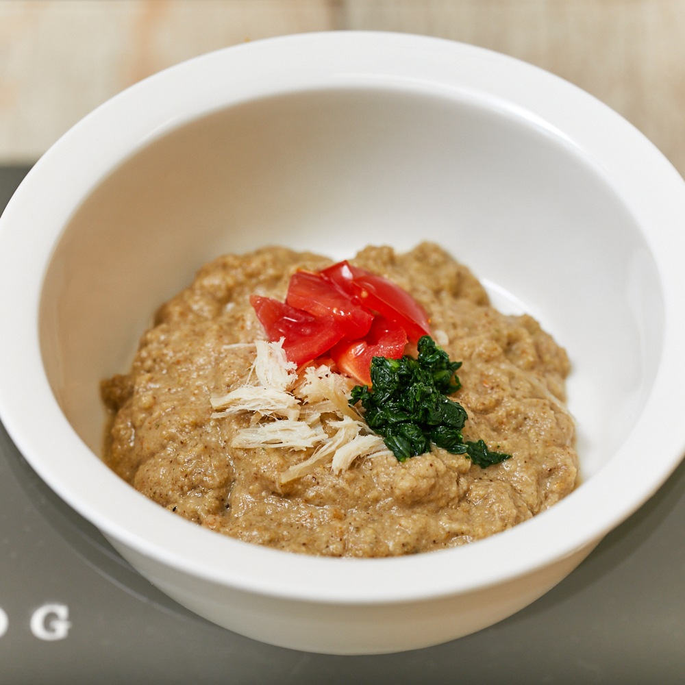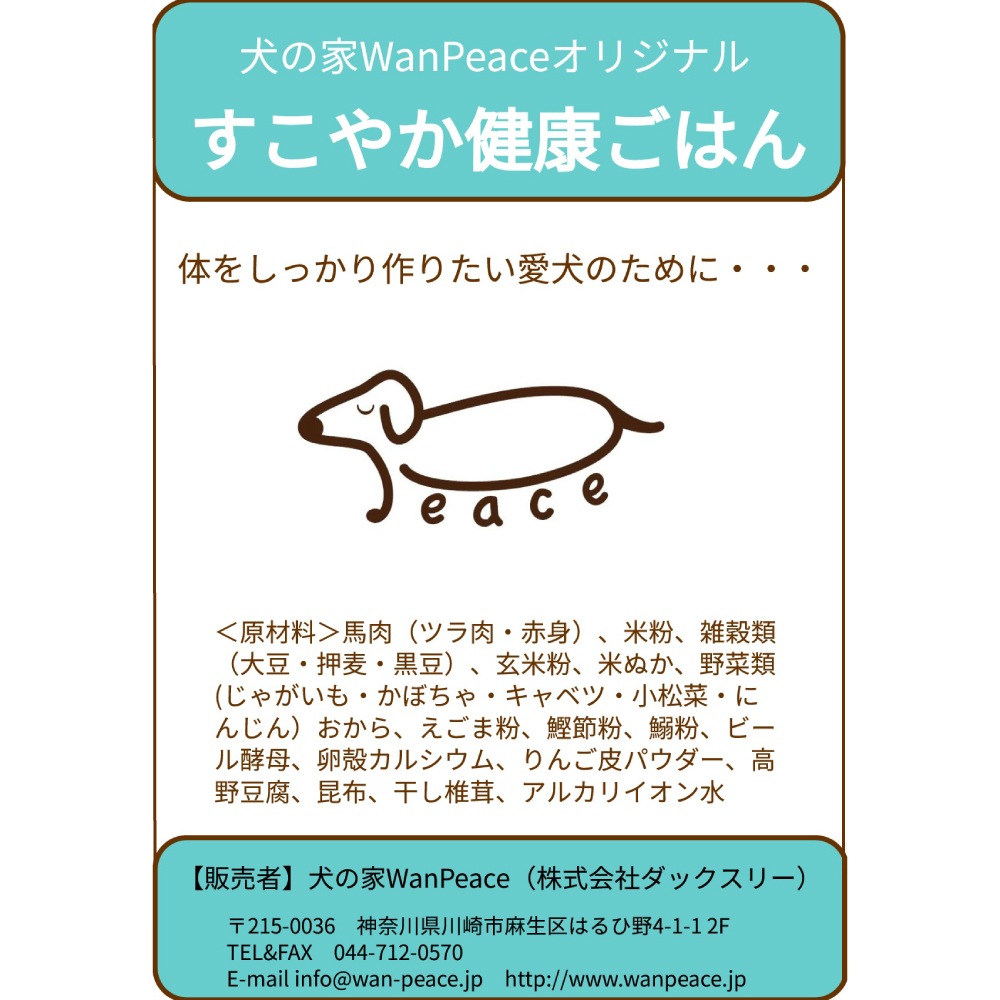 | 馬肉(ツラ肉・赤身)、米粉、雑穀類(大豆・押麦・黒豆)、玄米粉、米ぬか、野菜類(じゃがいも・かぼちゃ・キャベツ・小松菜・にんじん)、おから、えごま粉、鰹節粉、鰯粉、ビール酵母、卵殻カルシウム、りんご皮パウダー、高野豆腐、昆布、干し椎茸、アルカリイオン水 ※原材料以外のものは一切使用しておりません。 |