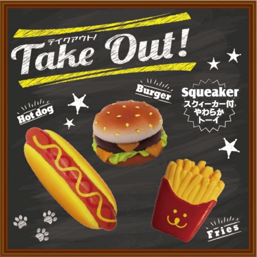 ファストフードの代表格、ハンバーガー・ポテト・ホットドッグをかわいいワンちゃんサイズに仕上げました。スクィーカーを鳴らしやすいやわらかラテックストーイです。3個セットです。